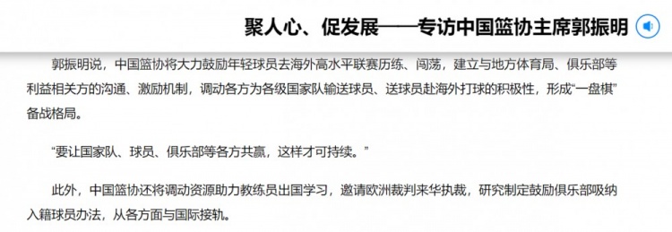 3月25日报道 篮协主席郭振明近日接受了新华社的专访,谈到了多个话题。其中一点,他表示中国篮协将大力鼓励年轻球员去海外高水平联赛历练、闯荡。