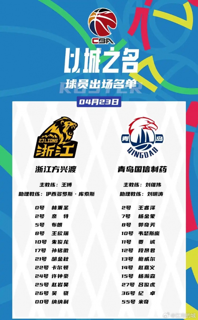 4月23日报道 今晚19点35,广厦和青岛的抢五大战将正式开打,双方大名单如下: