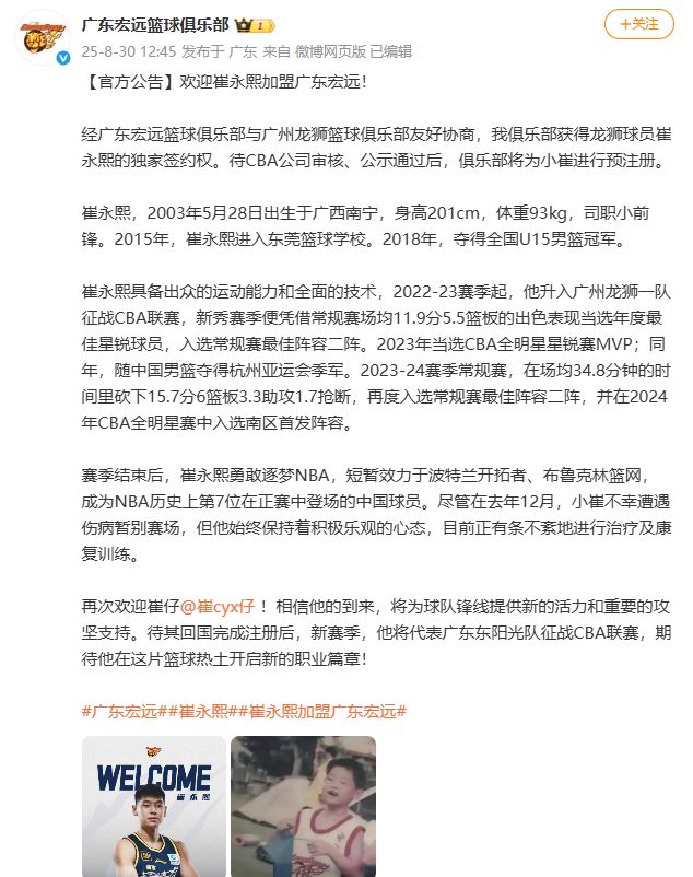 新京报讯 8月30日,广东宏远男篮官方微博发布官方公告,欢迎崔永熙加盟广东宏远!全文如下: