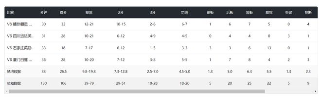 这五场比赛方敏拿到三场28+,一场30+,场均33分钟,拿到26.5分6.3篮板5.5助攻2.3抢断,命中率49.5%,三分命中率35.8%,她是山西女篮全锦赛第一得分手。(实际上她在9月6日才与山西签约,没想到刚刚签约就打成了绝对核心)
