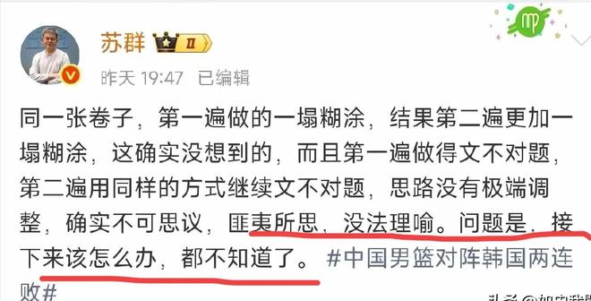 “男篮输给韩国,究其原因就是郭导的排兵布阵出现问题。”