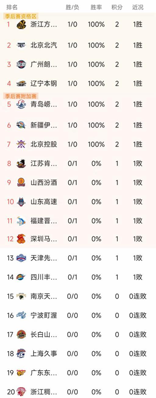 北京时间12月14日,新赛季的CBA常规赛在昨晚全面开打,第一轮已经结束了7场比赛,我们一起看看最新积分榜变动!