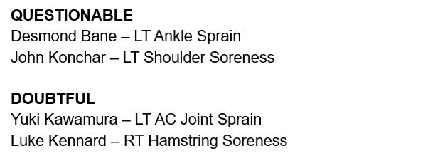 伤病报告显示,河村勇辉的伤从左肩酸痛更新为左肩肩锁关节扭伤,从出战成疑(50%)转为小概率出战(25%)。