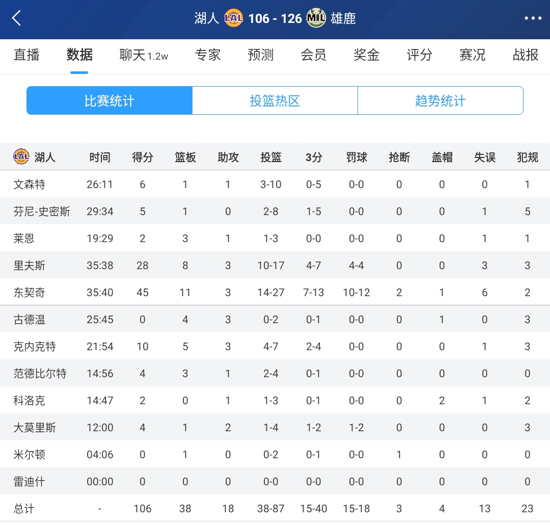 此役,湖人仅有三人得分上双,其中东契奇45分,里夫斯28分,克内克特10分。
