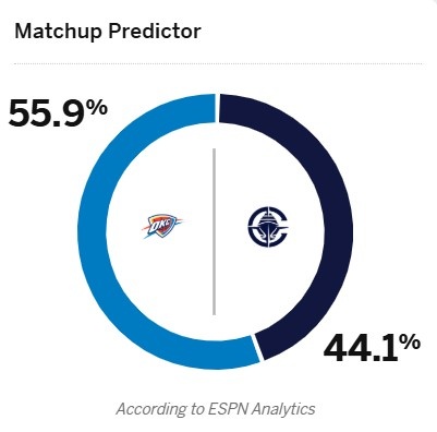 ESPN给出了本场比赛胜率预测,其中雷霆为55.9%,快船为44.1%。