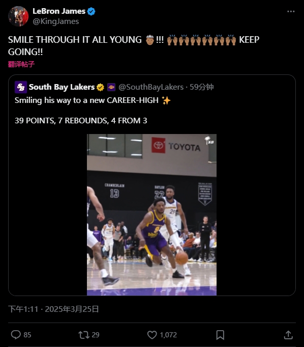 赛后,詹姆斯转发了布朗尼的赛场集锦并写道:“保持微笑,继续前进,年轻的王子!加油!”