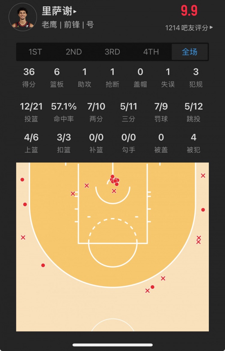 老鹰状元秀 扎卡里-里萨谢 登场34.5分钟