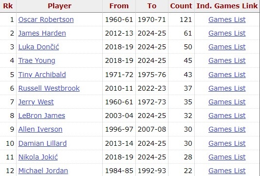 据统计,这是哈登生涯第62场比赛至少35分10助攻,历史第2多,仅次于大O(121)。