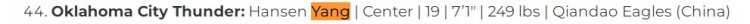 6月6日报道 今日美媒Sports Business Classroom晒出了最新的模拟选秀名单,其中中国球员杨瀚森在第44顺位被雷霆选中。