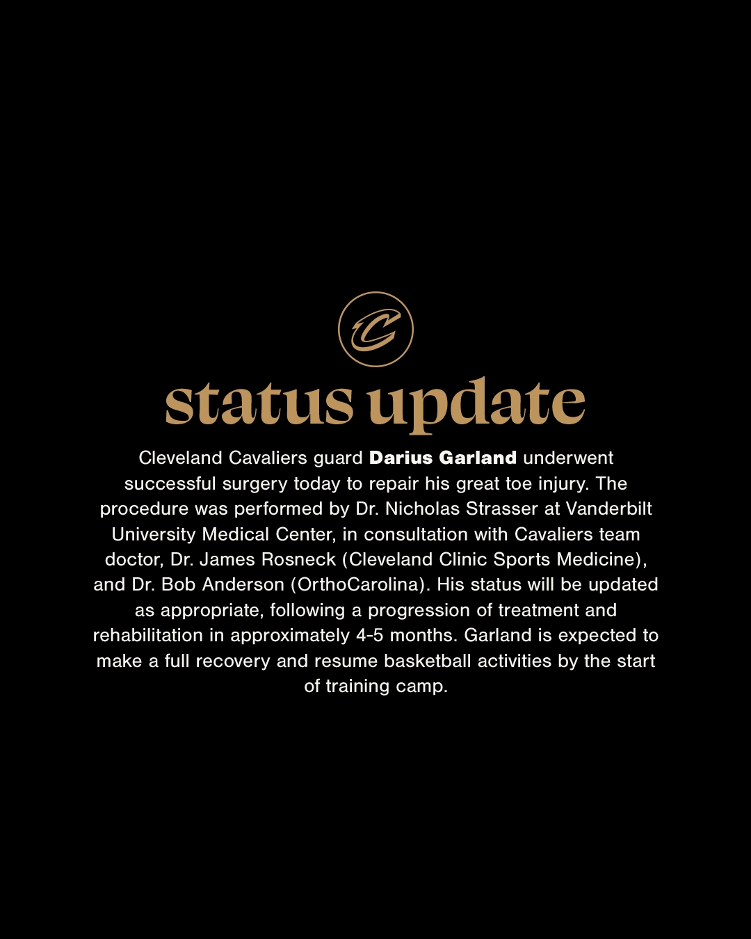 06月10日报道 骑士官方宣布,加兰成功接受了修复大脚趾伤势的手术。