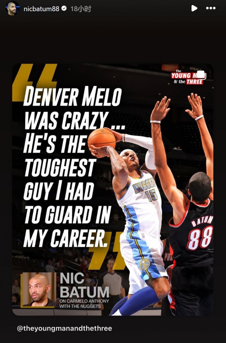 巴图姆说道:“丹佛的卡梅隆-安东尼非常疯狂。在我生涯初期,我非常年轻,并且很瘦弱,当时我首发就被要求去防守最强的对手。丹佛的安东尼,我会说,他什么都会。他很强壮,他是我生涯中最难防的家伙。”