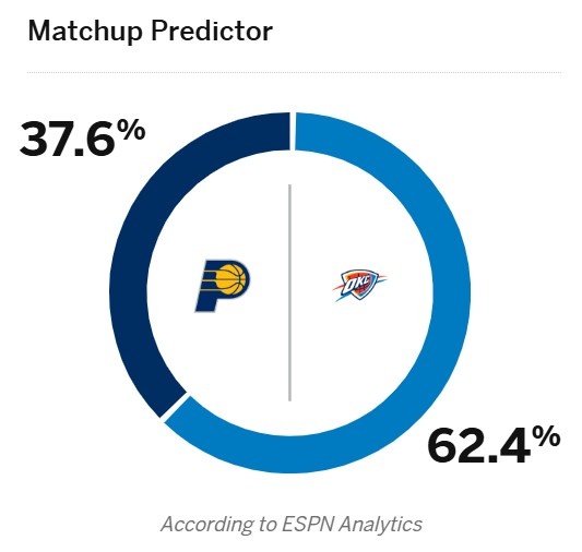 赛后,ESPN更新了总决赛抢七大战(雷霆主场)的胜率,雷霆62.4%,步行者37.6%。