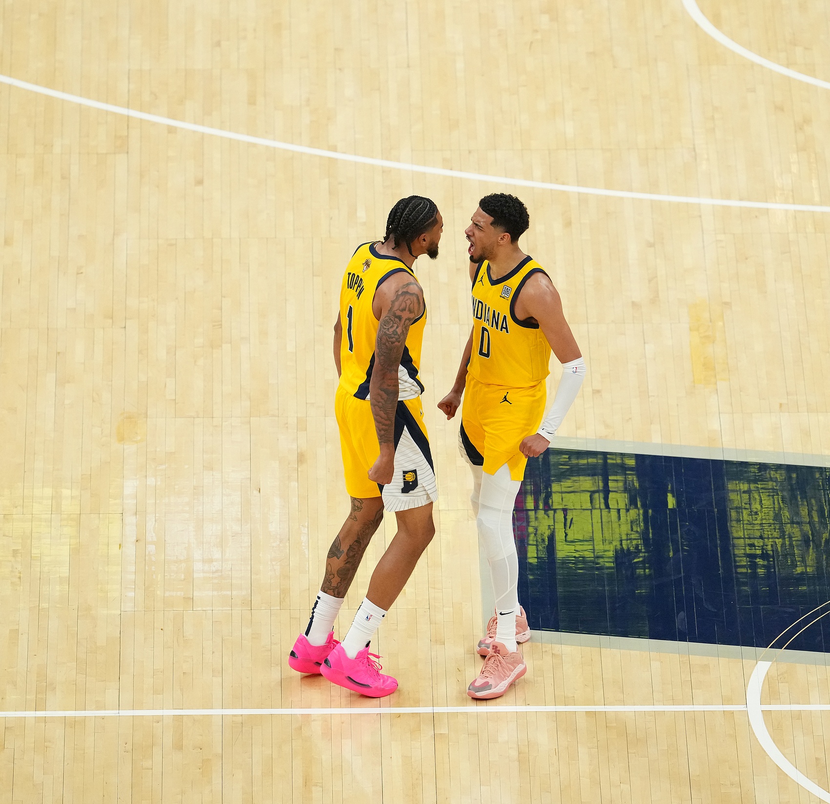 本场,哈利伯顿出场22分52秒,12投5中(三分7中3),罚球1中1,拿到14分1篮板5助攻2抢断,正负值+25是全场最高。托平表现出色,拿到全队最高分,23分钟的时间里,投篮12中6,三分球7中4,罚球6中4,砍下20分6篮板2抢断的数据,正负值+8。