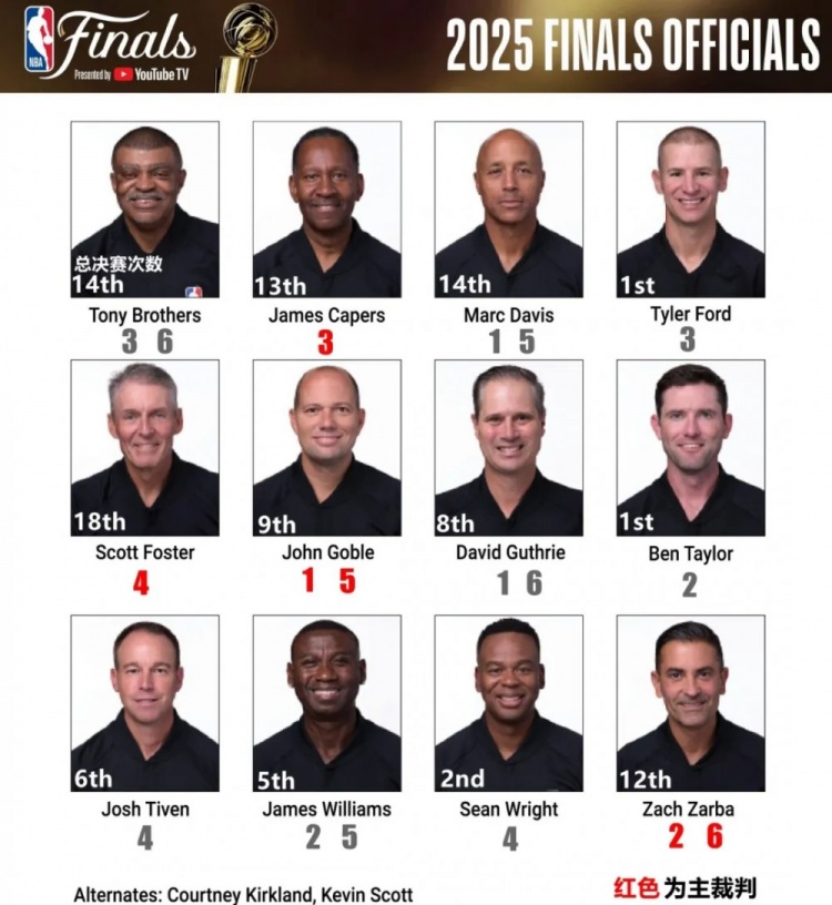 这次NBA为总决赛准备了14名裁判,其中12名为正选,2名为候补,以免出现裁判受伤的情况。
