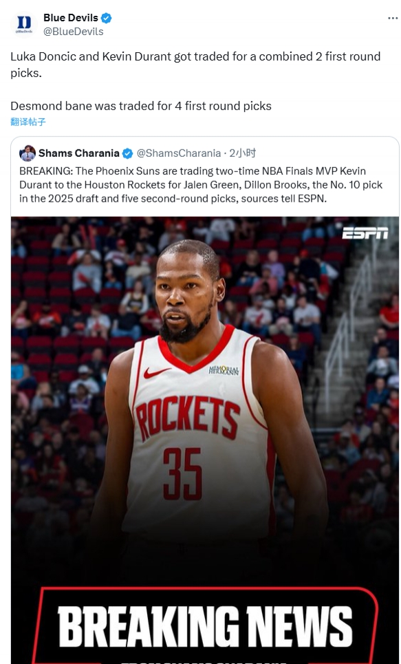 06月23日报道 ESPN名记Shams爆出重磅交易!多位消息人士透露,超级球星、36岁的杜兰特被送去火箭,太阳得到杰伦-格林、狄龙-布鲁克斯、2025年10号签和5个次轮签。
