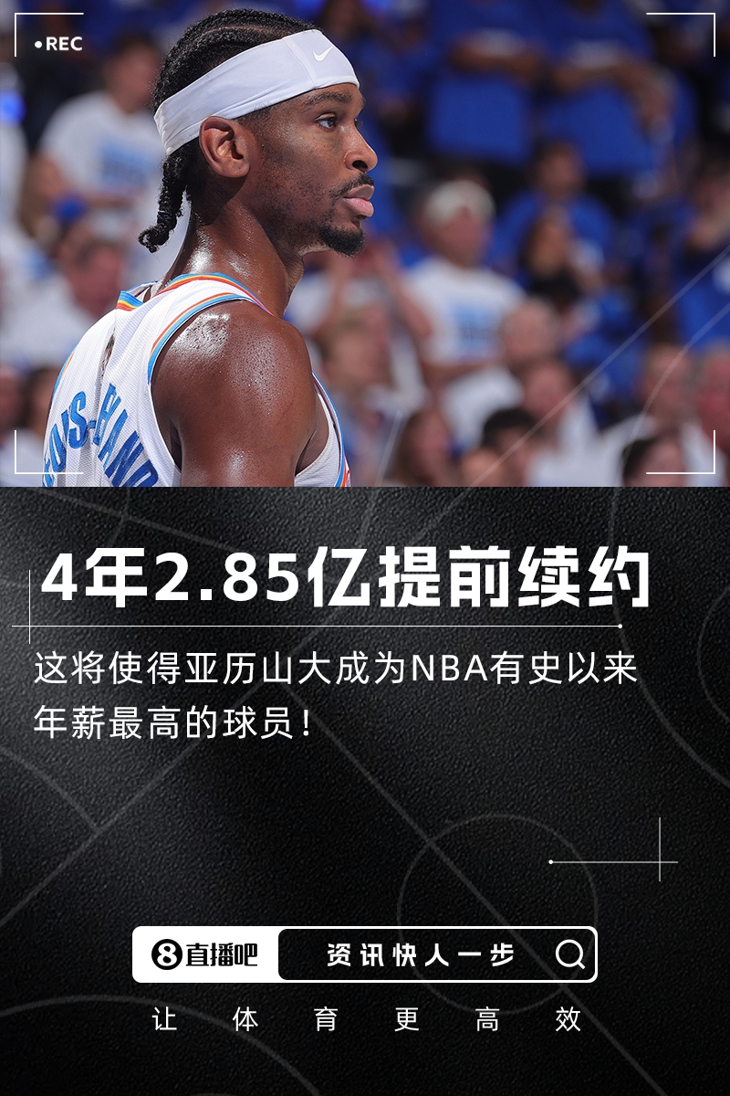 07月01日报道 Shams报道,亚历山大与雷霆达成超级顶薪的提前续约,合同为4年2.85亿美元,这将使他成为NBA历史上年薪最高的球员!