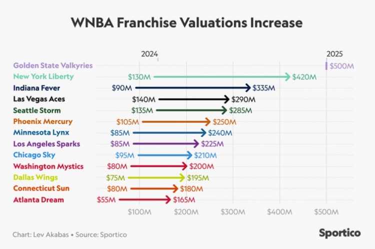 近两年,WNBA的商业估值全面上涨。据《Sportico》最新发布的榜单显示,2025年WNBA球队平均估值达1.3亿美元,较去年上涨180%。其中金州女武神高达5亿美元,一跃成为女子体育史上最值钱的俱乐部。