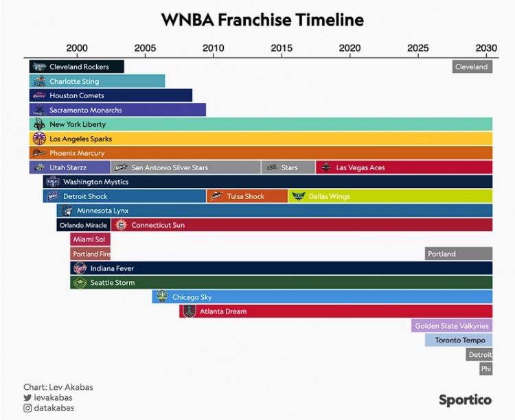 要知道,WNBA上一次的快速扩张,最终换来的是一轮清退。1997年创立后,联盟在1998-2000年里中从8队膨胀至16队,但也在2002-2009年里快速收缩至12队。