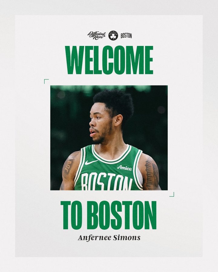 7月8日报道 今天,凯尔特人官方晒图欢迎安芬尼-西蒙斯的加盟。