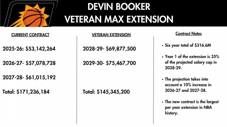尘埃落定后,薪资专家Bobby Marks梳理了布克的合同情况,他目前的合同还剩3年1.71亿,下赛季5314万,26-27赛季5708万,27-28赛季6102万;新续的是两年1.45亿,28-29赛季6988万,29-30赛季7546万。