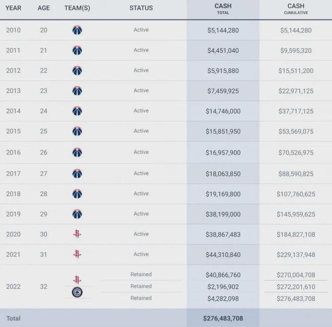 为期13年的NBA生涯里面,沃尔总薪资收入达到2.76亿美元,拿到过的最大两份合同为13年以五年8487万美元提前续约奇才,18年又以四年1.71亿美元提前续约奇才。