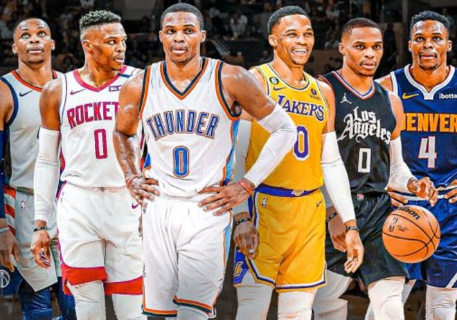 威斯布鲁克曾在2017年效力于雷霆队时获得常规赛MVP,他将在11月年满37岁。他的职业生涯至今效力过雷霆队、火箭队、奇才队、湖人队、快船队和掘金队。威少已经斩获203次三双,是目前NBA历史上三双次数最多的球员。
