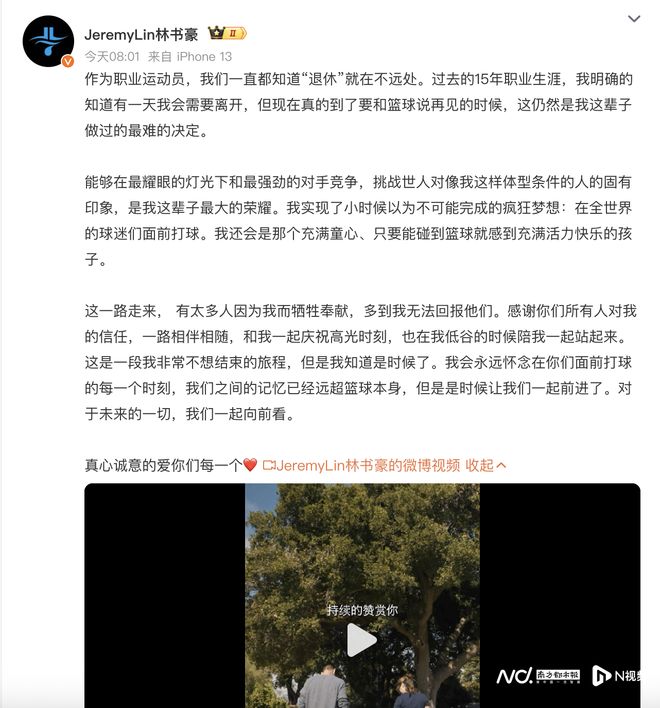 8月31日,林书豪正式在社交媒体宣布退役,并同步晒出陪伴妻儿的视频画面,暗示未来的重心将转向家庭。