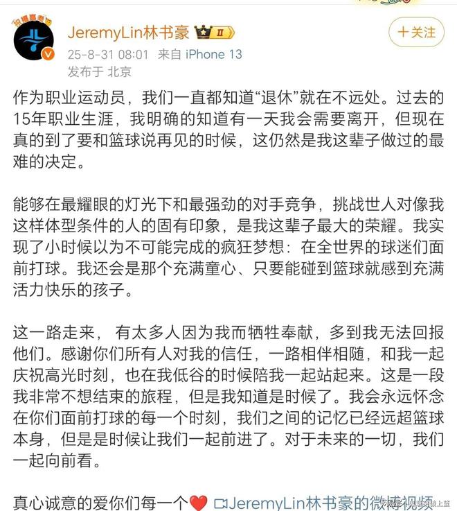 过去这些年,我们亲眼目睹了一个又一个曾在NBA赛场叱咤风云的球星宣布退役!而在八月的最后一天,曾在全球掀起“林疯狂”热潮的林书豪,也在其个人社媒上突然宣布退役,从而正式结束了他长达15年的篮球职业生涯!