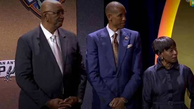 颁奖典礼上,雷吉米勒和乔治格文陪着打扮庄重的凯西埃文斯上了台,凯西用一段录制好的视频替代丈夫完成了致辞。从此,这位执法28年,吹了1969场常规赛、170场季后赛、35场总决赛,4场全明星赛的一代名哨,正式成为NBA名人堂+一员。