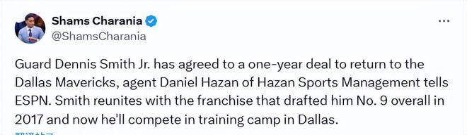 北京时间9月19日,据名记Shams报道,后卫小丹尼斯-史密斯已同意与达拉斯独行侠队签下一份为期一年的合约,重返老东家效力。