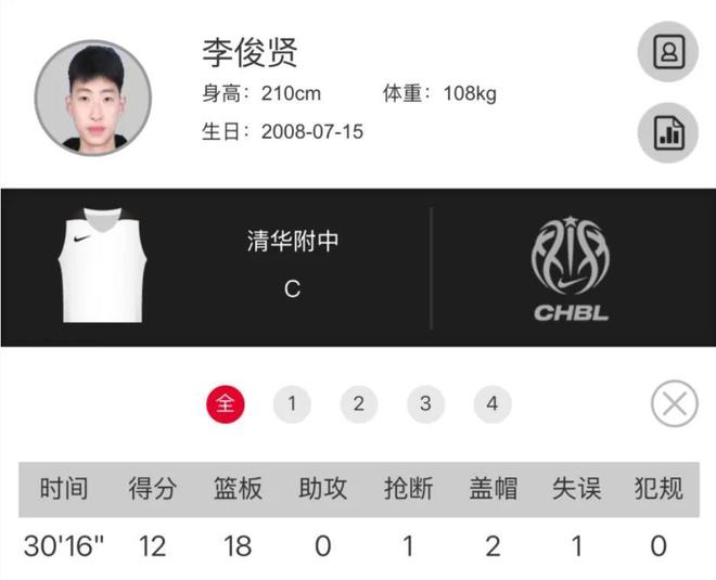 今年的耐高联赛北区决赛中,李俊贤拿到19分12篮板5盖帽的数据,不仅带领球队进入总决赛,还拿到了北区MVP;总决赛上清华附中不敌广东省实验中学,李俊贤拿到12分18篮板1抢断2盖帽的数据。前段时间李俊贤出战CBA夏季联赛东营站,9月13日青岛队对阵天津队的比赛中,李俊贤拿到13分5篮板的数据,投篮命中率56%。