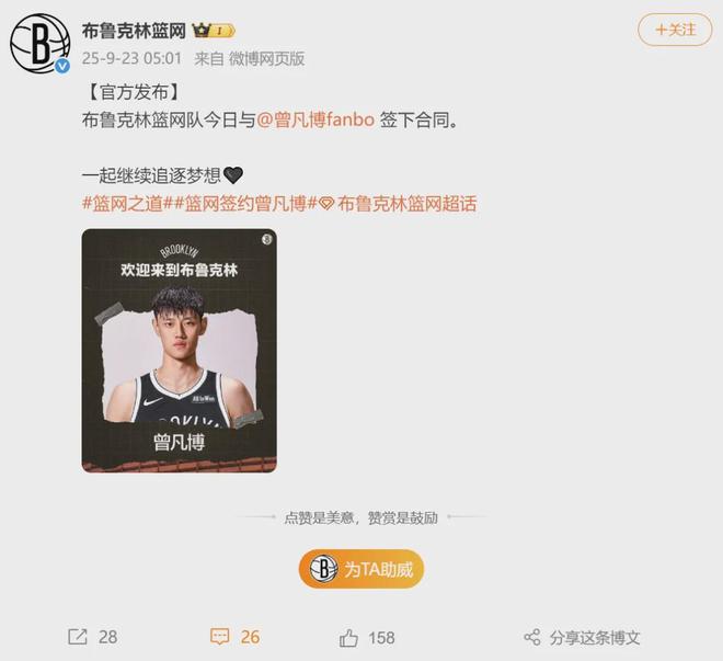 北京时间9月23日,布鲁克林篮网官方宣布:正式签约中国球员曾凡博,他将身披12号球衣。此前曾凡博在点燃队效力时,同样身穿12号。尽管篮网还有一个双向合同名额,但他们给曾凡博的并不是双向合同,而是Exhibit 10合同。