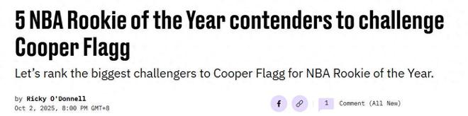 扭转不及格的D评分,杨瀚森凭借自身表现获得美媒力挺!美媒《sbnation》晒出5人名单,相信杨瀚森将在新赛季携手另外4大新星与“美国之子”弗拉格竞争最佳新秀。