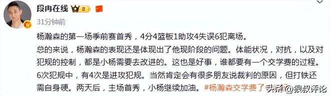 这也是好事,谁都要有一个交学费的过程。6次犯规中,有4次是进攻犯规。当然肯定会有很多朋友说裁判的原因,但打铁还需自身硬。两天后,主场首秀,小杨继续加油。”