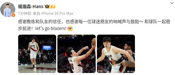 社媒原文:“感谢教练和队友的信任,也感谢每一位球迷朋友的呐喊声与鼓励,和球队一起稳步前进!let's go blazers!”