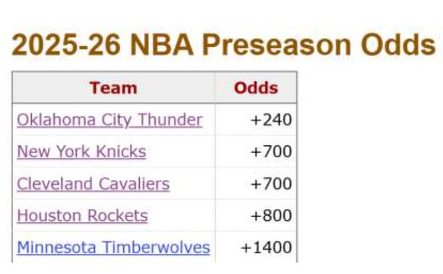 ESPN的冠军赔率:雷霆 +200,断层第一;
