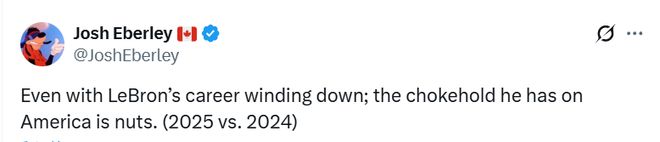 詹姆斯的人气继续断层优势霸榜,NBA记者Josh Eberley晒出了今年和去年的对比图,感慨道:“即使勒布朗的职业生涯已接近尾声,但他在美国的影响力依然惊人。(2025年对比2024年)”