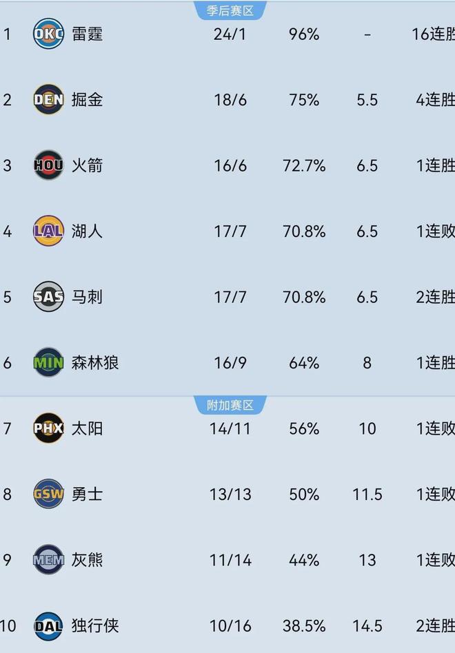 尽管文班亚马长期缺阵,马刺依然展现出了不俗的战斗力,本赛季至今以17胜7负排名西部第五,战绩和西部第四的湖人持平,仅落后西部第二的掘金1个胜场。