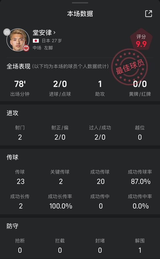 值得一提的是,本场比赛堂安律的媒体评分高达9.9分!
