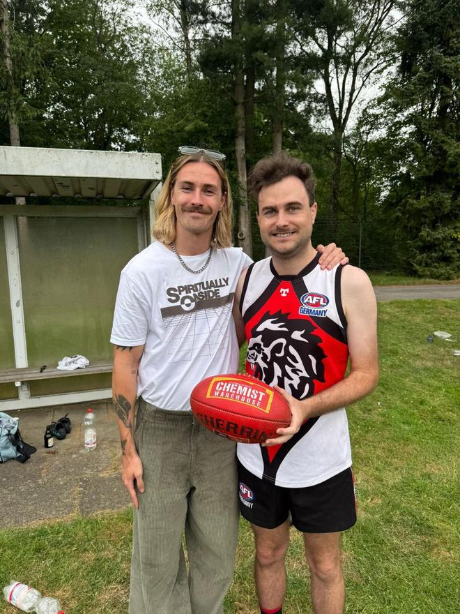 (配图说明:马修・卡拉吉奇在汉堡莱茵兰雄狮澳大利亚式足球俱乐部(Rheinland Lions Australian Football Club e.V)参加澳式足球联赛(AFL)赛后,与澳大利亚国脚杰克逊・欧文会面。没有比这更具澳大利亚特色的场景了!(图片来源:作者提供))