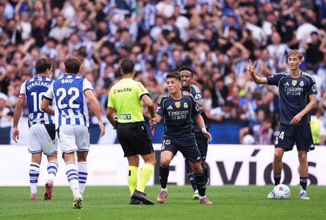 多一人作战的皇家社会,开始在肋部做文章,第50分钟终于撕开了皇马的后防,可惜巴雷内切亚的打门被左侧立柱弹出后,又被右侧立柱拒绝,错失了缩小分差的绝佳机会,不过4分钟之后,皇家社会的进攻造成了卡瓦哈尔的禁区内手球,主裁判给了主队一粒点球,奥亚萨瓦尔稳稳主罚命中,将比分追至1-2。