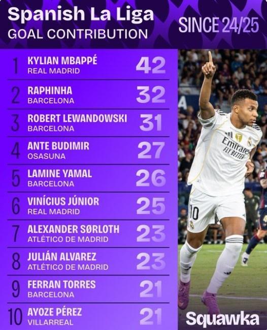 直播吧9月25日宣 本赛季,皇马射手姆巴佩延续了良好的状态,法国人在西甲中已经打进7球。根据Squawka的数据统计,上赛季以来,姆巴佩在西甲直接参与42球位居榜首。