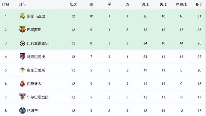 在本轮的另外一场比赛中,巴萨在客场4-2击败塞尔塔。在目前的积分榜上,虽然皇马12战积31分,依然领先巴萨3分,但是在净胜球这一数据上,巴萨17个,超过了皇马的16个。接下来皇马四个客场对手分别为埃尔切、奥林匹亚科斯、赫罗纳和毕尔巴鄂竞技。本赛季西甲争冠的悬念,再度开启!