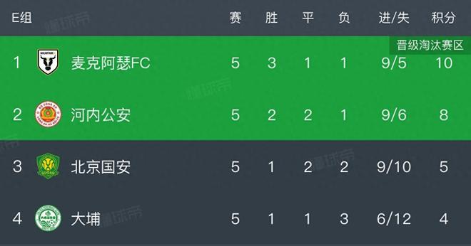 亚冠二级联赛第5轮迎来焦点对决,北京国安客场挑战河内公安,林良铭破门,张健智扑点,毛克扳平,阮庭北补时绝杀,最终北京国安1:2遭到河内公安逆转,依然排名第三,不过落后第二名河内公安3分,且胜负关系处于劣势,已经提前一轮出局。麦克阿瑟和河内公安提前锁定晋级名额。