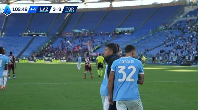 但比赛第95分,拉齐奥队诺斯林禁区内被撞到,裁判观看VAR后判罚点球。此时时间来到103分钟,拉齐奥由卡塔尔迪点球打进扳平比分,最终补时阶段拉齐奥抢回一分。