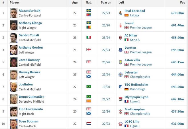 排在埃兰加后面的是意大利中场托纳利,他在2023年以5890万欧元的转会费从米兰转会而来。