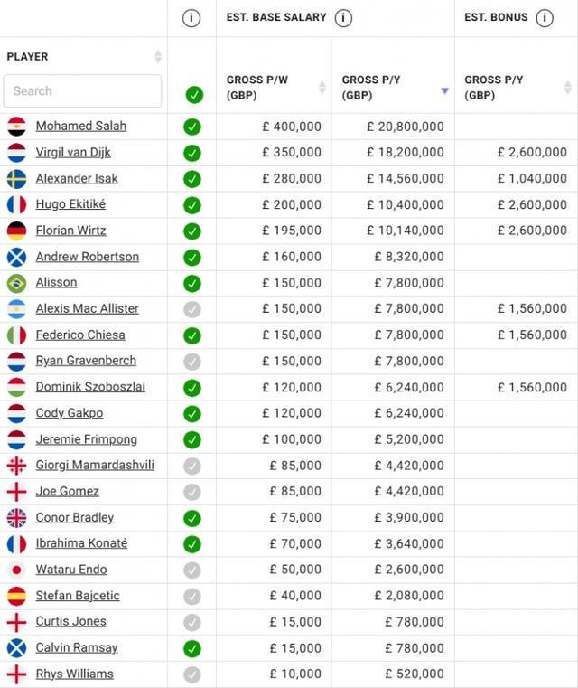 目前利物浦20万镑以上的顶薪球员已经有4个,萨拉赫(40万)、范迪克(35万)、伊萨克(28万)和埃基蒂克(20万),而维尔茨(19.5万)也很接近20万。