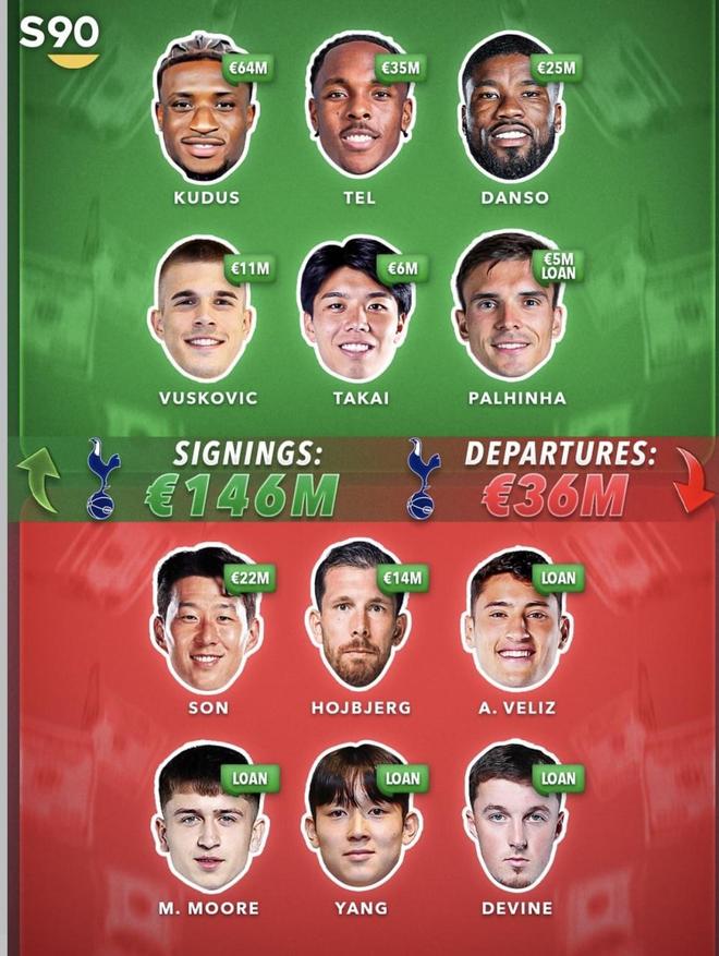 卖人方面回收 3600万:孙兴慜2200万,赫伊别尔1400万,其他球员则以租借为主。