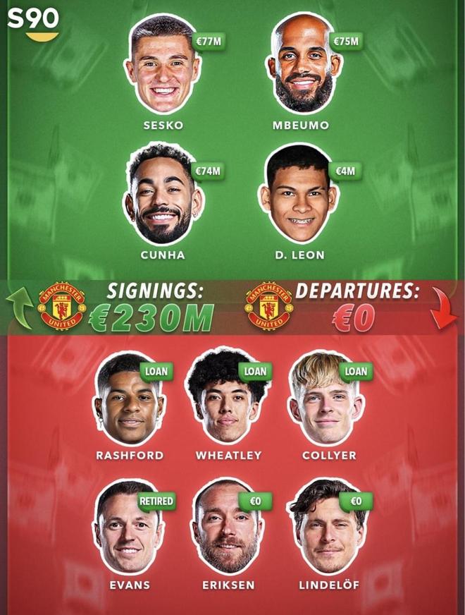 但卖人方面却是零收入:拉什福德、韦特利、科利尔都只是租借,林德洛夫和埃里克森自由离队,老将埃文斯退役。