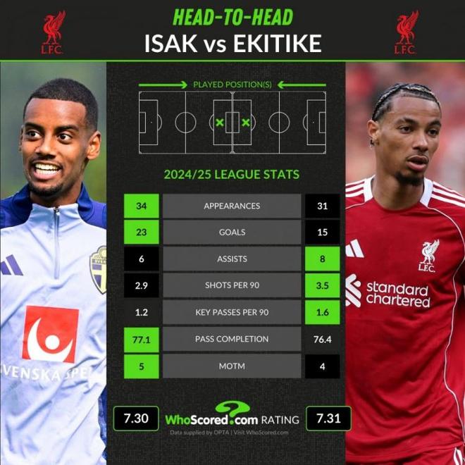直播吧9月5日宣 利物浦在今夏先后花费重金签下了埃基蒂克和伊萨克,whoscored也对比了两人在上赛季联赛的关键数据。